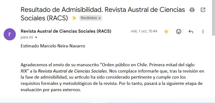 Artículo “Orden público en Chile. Primera mitad del siglo XIX” Noviembre 3, 2025 Artículo en evaluación, en “Revista Austral de Ciencias Sociales”, Facultad de Filosofía y Humanidades, Univeresidad Austral de Chile, miércoles 01 de octubre de 2025.
