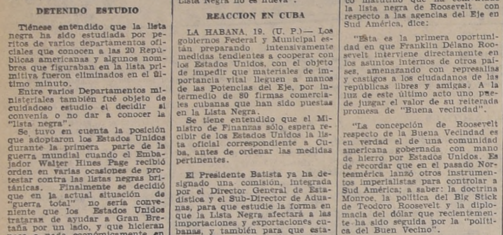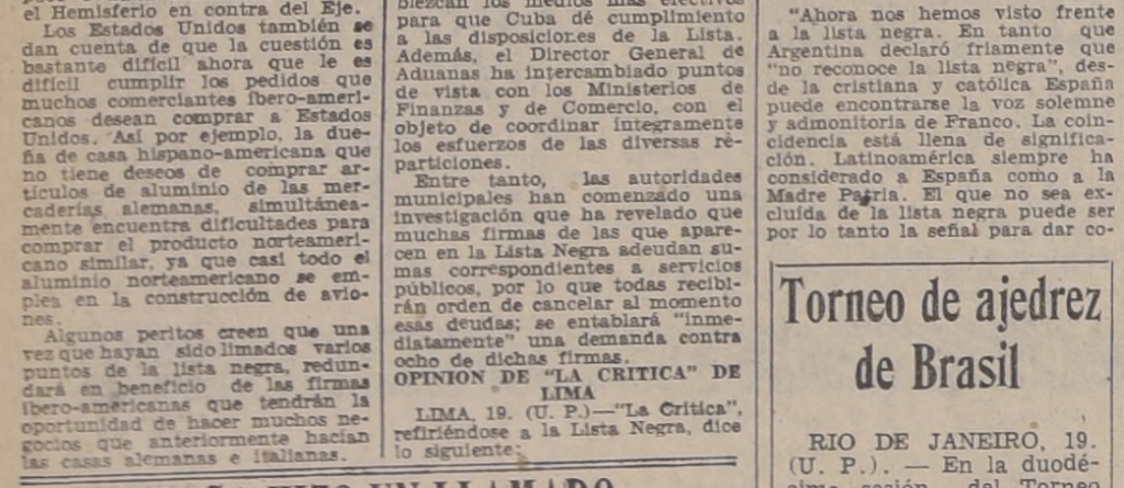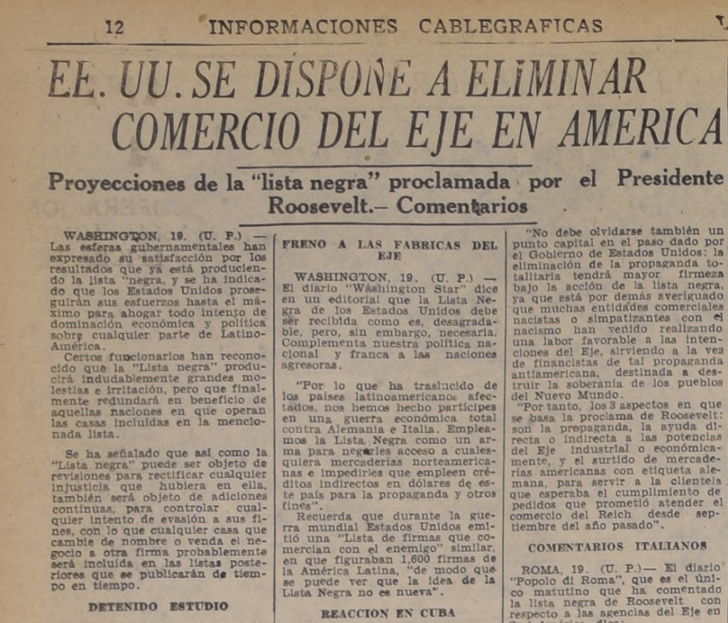 Repositorio. Lista negra. Comercio A.L. Diciembre 28, 2025 EE.UU se dispone a eliminar comercio del eje en América. Proyecciones de la “lista negra” proclamada por el Presidente Roosvelt. Comentarios, Diario La Nación, 20 de julio de 1941, pág. 12.