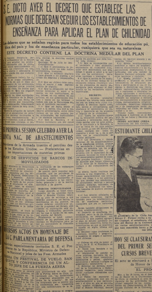 Repositorio. Plan de chilenidad Diciembre 29, 2025 S.E. dictó ayer el decreto que establece las normas que deberán seguir los establecimientos de enseñanza para aplicar el plan de chilenidad, Diario La Nación, sábado 26 de julio de 1941, pág. 11.