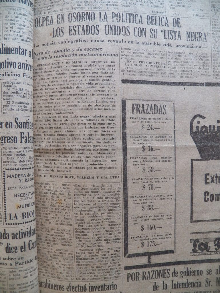 Repositorio. Lista Negra Diciembre 30, 2025 Golpea en Osorno la política bélica de Estados Unidos con su “Lista negra”, Diario La Prensa, Osorno, 19/07/1941, pág. 7.
